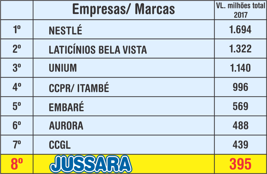 A Jussara ocupa posição de destaque no Ranking Maiores Laticínios do Brasil de 2017, publicado pela Leite Brasil (Associação Brasileira dos Produtores de Leite), na 8ª colocação.