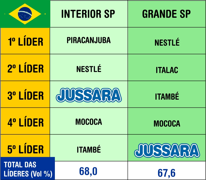 Na mesma pesquisa o Leite Condensado Jussara ocupa a 3ª colocação na preferência dos consumidores do interior de São Paulo e a 5ª colocação entre as marcas que lideram na capital.