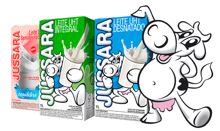 Nas embalagens nossa querida vaquinha aparece oferecendo um saboroso copo de leite, com o objetivo de aguçar os sentidos do consumidor, estimulando o consumo deste produto que define a essência da Jussara.