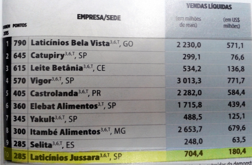 Nesta edição, a Jussara ocupa a 10ª posição entre as melhores empresas do setor leiteiro.