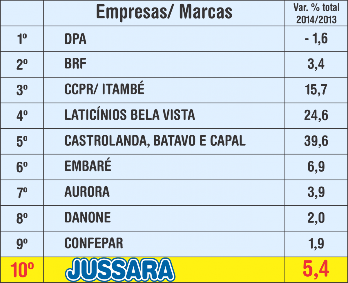 De acordo com o Ranking Maiores Laticínios do Brasil 2014, publicado recentemente pela Leite Brasil (Associação Brasileira dos Produtores de Leite), a Jussara figura entre os 10 maiores.