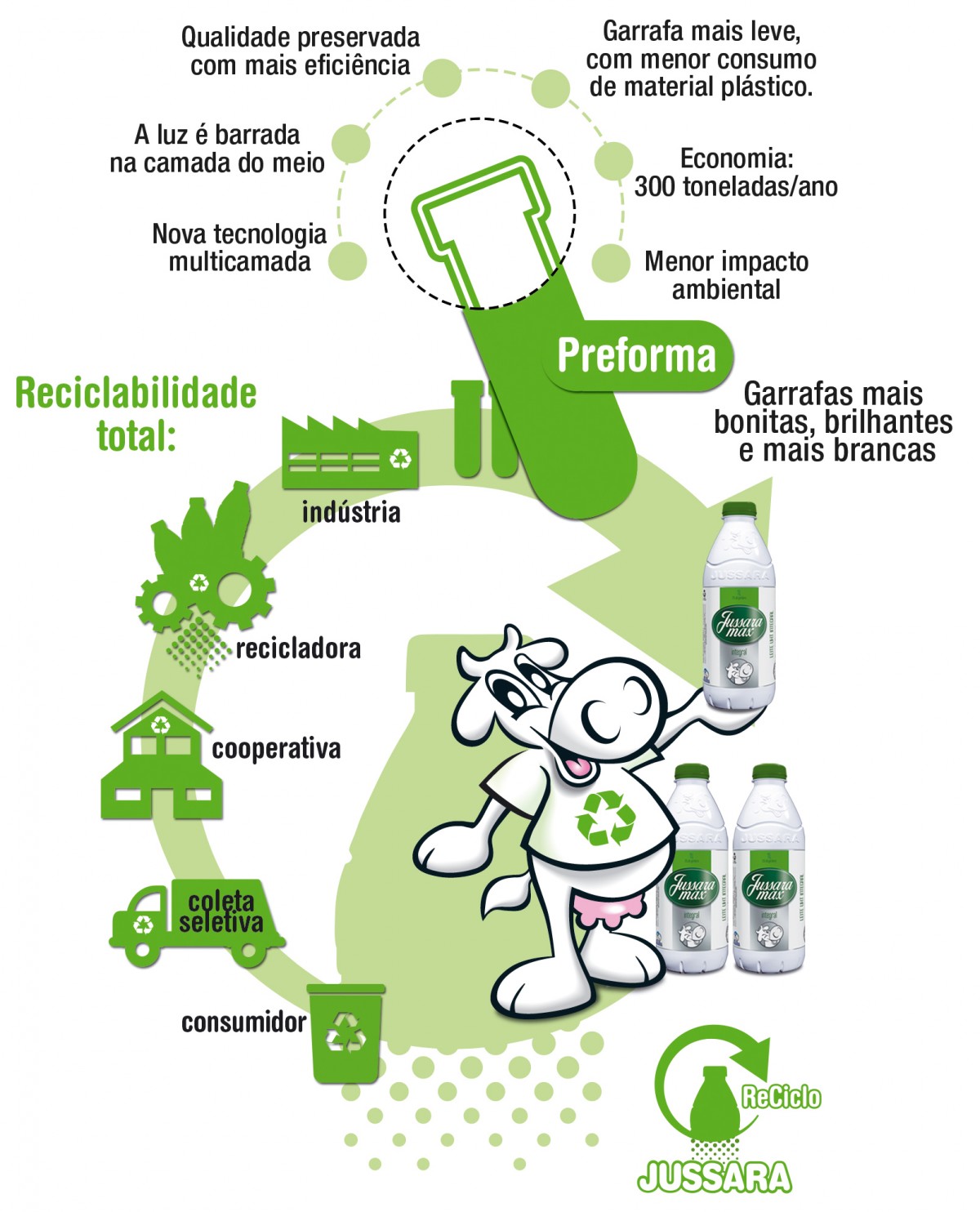 Através do Projeto ReCiclo JUSSARA, pioneiro nesta iniciativa, utilizamos inicialmente, pequena parte de resina reciclada, adicionada à resina virgem, na produção de novas garrafas.