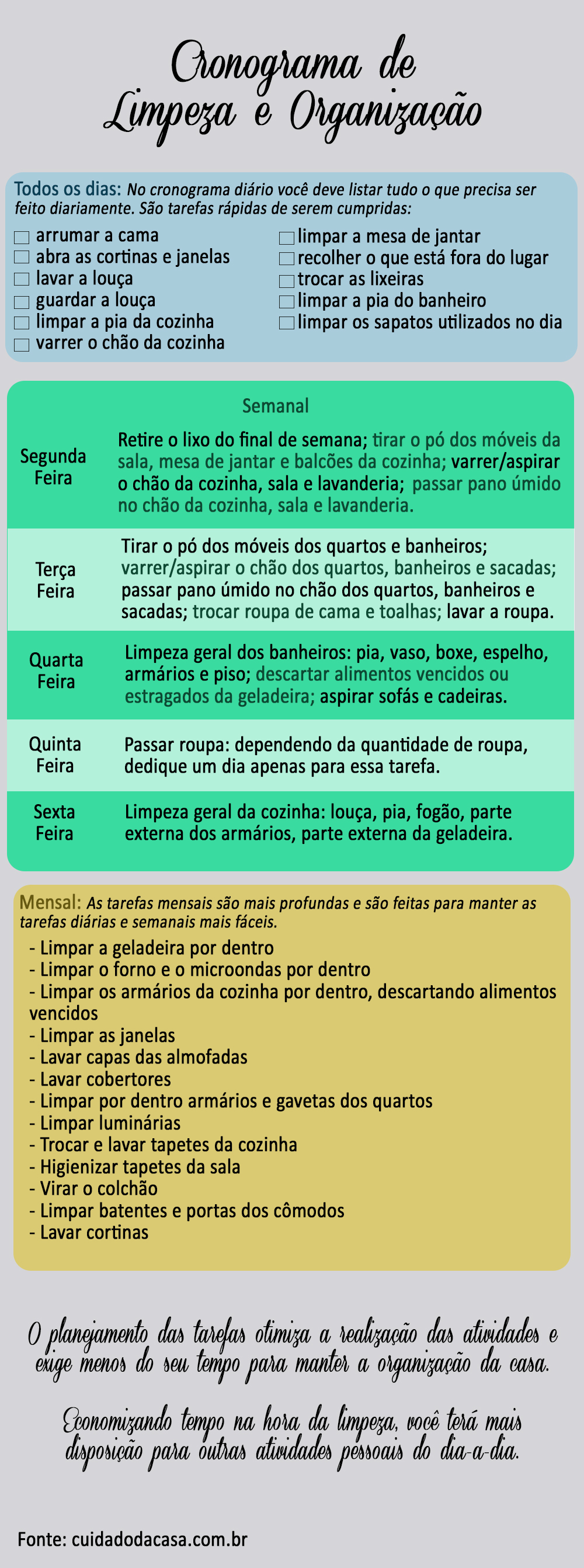 Para facilitar, segue abaixo uma sugestão de cronograma de organização e limpeza que você pode usar. Salve e faça as adequações que precisar, de acordo com as necessidades do seu lar: